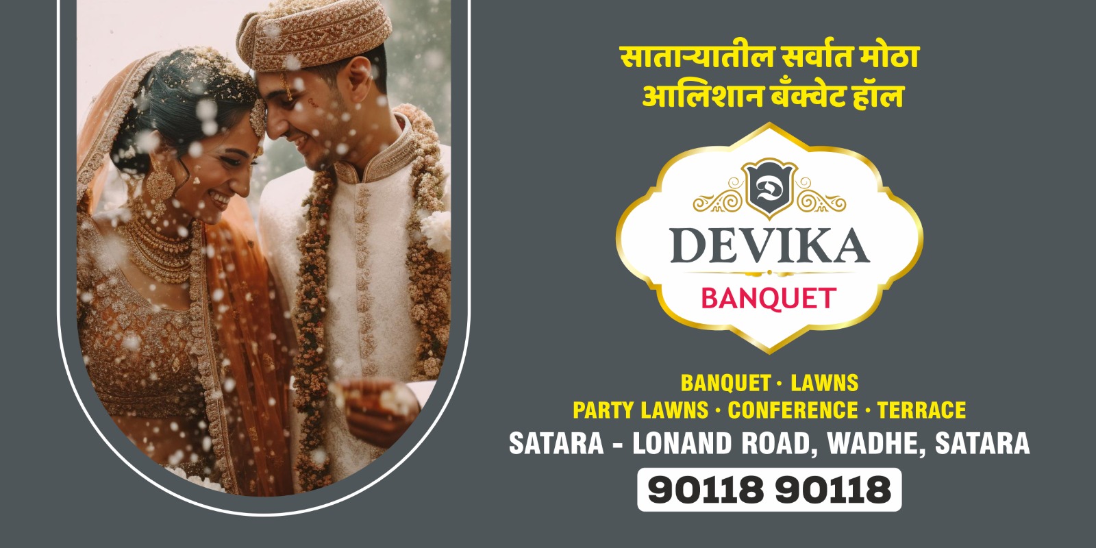 Devika Banquet, located in Satara, Maharashtra, offers versatile event spaces suitable for various occasions, from intimate gatherings to grand wedding celebrations. The venue features a spacious banquet hall and two expansive lawns, accommodating up to 1,200 guests. Amenities include ample parking for approximately 100 vehicles and eight complimentary changing rooms. The venue provides in-house decoration services and allows outside catering, ensuring a personalized experience for your event.